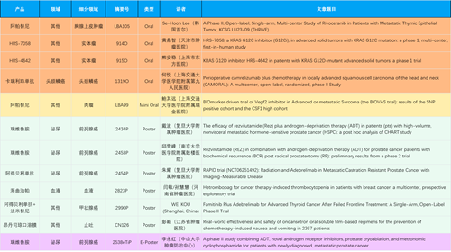 在胸腺上皮肿瘤、头颈鳞癌、肉瘤、前列腺癌、甲状腺癌等其他多个疾病领域,卡瑞利珠单抗、阿帕替尼、瑞维鲁胺、阿得贝利单抗、法米替尼、HRS-7058、HRS-4642等抗肿瘤创新药相关研究一共入选了4项口头报告、1项简短口头报告、4项壁报、1项电子壁报,彰显了AG官网医药强大的研发实力。此外,海曲泊帕和昂丹司琼口溶膜分别在防治化疗导致的血小板减少和恶心呕吐方面各有1项研究入选壁报。